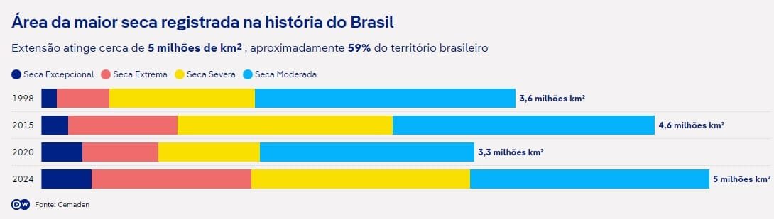 Depois teve a seca de 2015 e 2016, que foi muito extensiva e afetou grande parte do Centro-Norte do país. Agora, na seca que teve início em 2023 e continua até hoje, é a primeira vez que vemos essa condição de Norte a Sudeste do país“, avaliou a pesquisadora do Cemaden. (Texto da DW)
