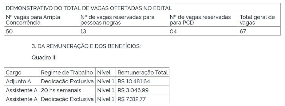 De acordo com o edital publicado no Diário Oficial da União, foram abertas 67 vagas, com provimento imediato nas diversas áreas de conhecimento.