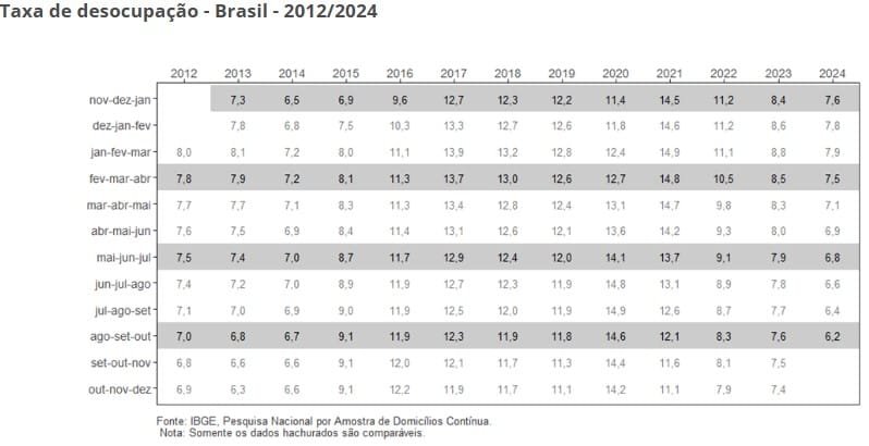 A população desocupada recuou para 6,8 milhões, ou seja, 8% a menos (menos 591 mil pessoas) em relação ao trimestre anterior e 17,2% inferior a outubro de 2023 (menos 1,4 milhão de pessoas). É o menor contingente de desocupados desde o trimestre encerrado em dezembro de 2014.