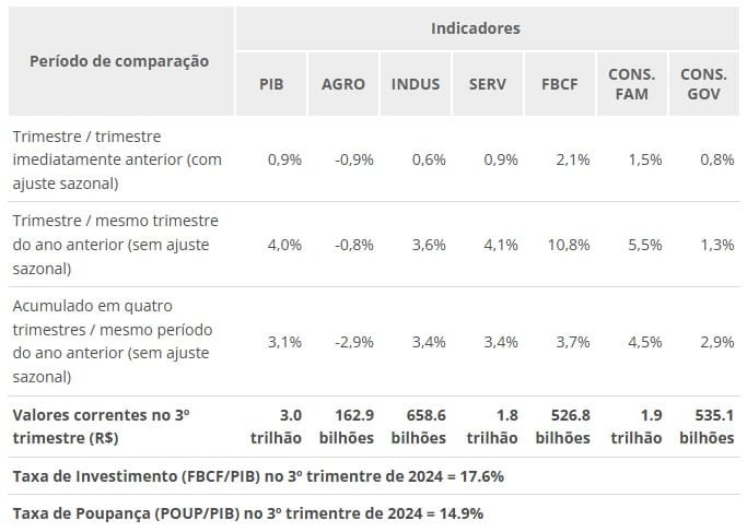 O IBGE informou há pouco que no terceiro trimestre de 2024, o PIB cresceu 0,9% frente ao segundo trimestre de 2024, na série com ajuste sazonal.