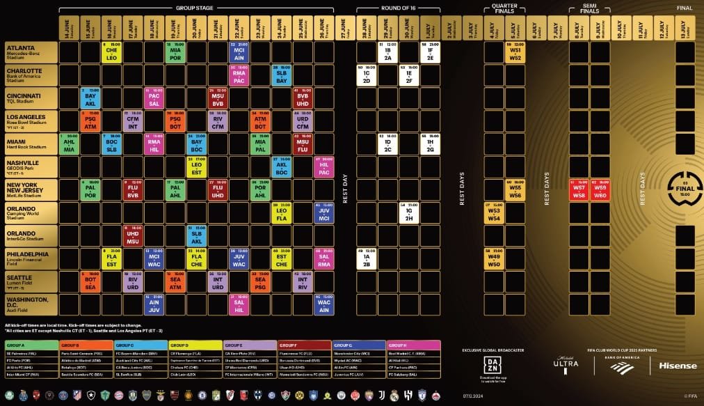 A Federação Internacional de Futebol (Fifa) anunciou neste sábado (07) a tabela completa da primeira fase do Mundial de Clubes de 2025, competição que será disputado nos Estados Unidos entre os dias 14 de junho e 13 de julho.