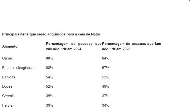E, apesar de o preço das carnes ter subido 8% nos últimos 12 meses (de outubro a outubro), segundo o Instituto Brasileiro de Geografia e Estatística (IBGE), o item ainda é a principal escolha das pessoas quando questionadas sobre o que pretendem comprar para a ceia de Natal.
