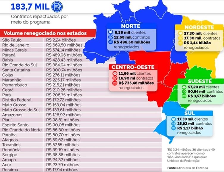 O programa registrou no Sudeste a participação de 57.219 clientes, que fecharam 90.841 contratos. Em seguida, em volume negociado, aparece a região Nordeste, com R$ 1,443 bilhão, 27.306 clientes e 37.306 contratos.