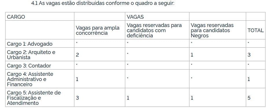 Entre as funções que estão com oportunidades abertas estão a de advogado, arquiteto, urbanista, contador e assistente administrativo técnico. Veja o quadro abaixo.