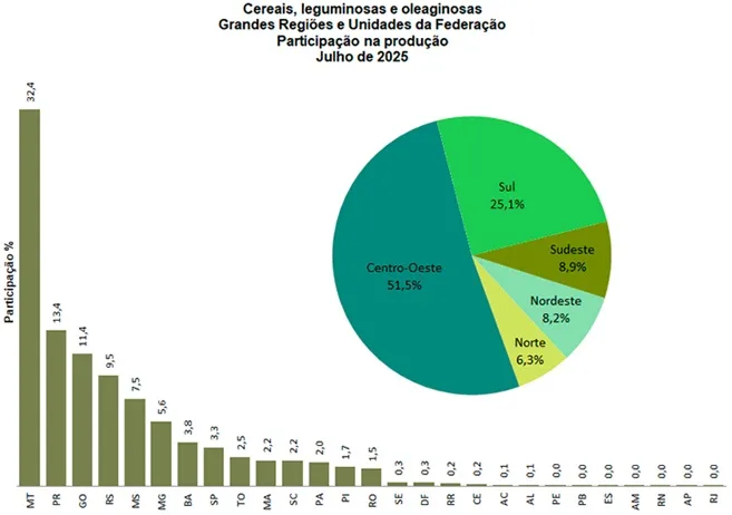 A produção de cereais, leguminosas e oleaginosas estimada para 2025 deve totalizar 340,5 milhões de toneladas em julho, de acordo com levantamento realizado pelo IBGE.