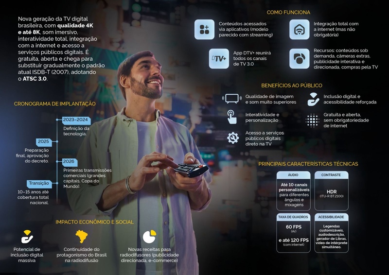 A TV 3.0 é um novo padrão que revolucionará a TV aberta, promovendo uma integração completa dos canais com a internet. Não haverá mais canais tradicionais, mas sim aplicativos nos aparelhos. A migração será gradativa, com início nas grandes capitais.