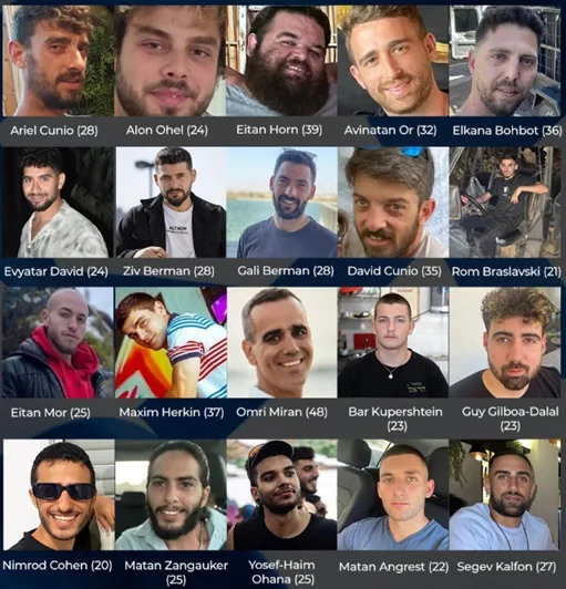 Trata-se de Nimrod Cohen (20), capturado em um tanque perto da fronteira com Gaza; Rom Braslavski (21) e Bar Kupershtein (23), sequestrados enquanto trabalhavam no festival de música Nova; e Evyatar David (24), Maxim Herkin (37), Elkana Bohbot (36), Segev Kalfon (27) e Yosef Haim Ohana (24), também capturados nesse festival.