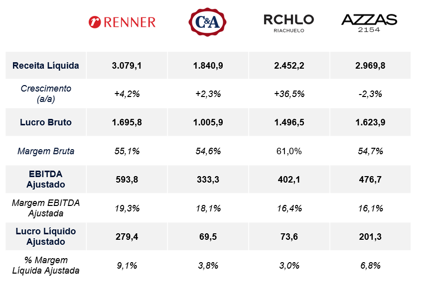 A Riachuelo apresentou o maior crescimento da receita líquida (a/a), atingindo +36,5%, o que a posicionou com a segunda maior receital líquida (R$ 2.452,2 milhões).