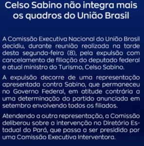 O União Brasil expulsou, nesta segunda-feira (08), o ministro do Turismo, Celso Sabino. Em setembro, o União Brasil obrigou a saída de todos os filiados de cargos ocupados na gestão do presidente Luiz Inácio Lula da Silva (PT).
