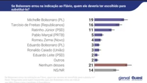 As pessoas que responderam ao questionamento disseram que oex-presidente deveria ter escolhido Michelle Bolsonaro, a ex-primeira dama. As indicações receberam, 19%. Em segundo neste ranking aparece o governador de São Paulo, Tarcício de Freitas (Republicanos) e em terceiro, o govbernador do Paraná Ratinho Júnior (PSD).