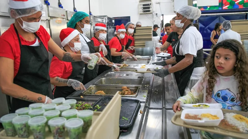 Menina leva a bandeira com prato de comida no Restaurante Comunitário do Itapoá, integrado à campanha Nosso Natal/André Feitosa/PCDF