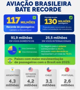 O transporte aéreo movimentou mais de 117 milhões de passageiros entre janeiro e novembro, um número 9,3% superior ao registrado no mesmo período de 2024. O número de assentos comercializados em voos domésticos (91,9 milhões) cresceu 8% sobre os números do ano passado.