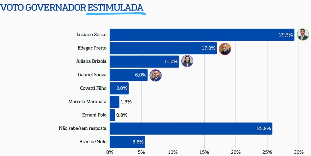 Quando os nomes dos candidatos são apresentados aos entrevistados — Zucco aparece com 29,3% das intenções de voto, abrindo vantagem sobre o segundo colocado, que soma 17,0%.