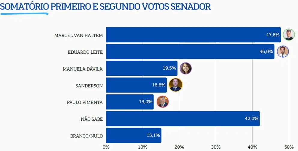 O atual governador, Eduardo Leite (PSD) aparece com ligeira vantagem sobre o deputado federal Marcel van Haten (PL). Se as eleições fossem hoje, os dois estariam virtualmente eleitos para as duas vagas.