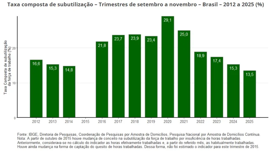 | Taxa de subutilização | 13,5% | 14,1% | 15,3% |