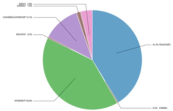 Representa um investimento de R$ 838 milhões em mídia durante o ano passado. A televisão recebeu o maior bolo, seguido da internet e mídia exterior.