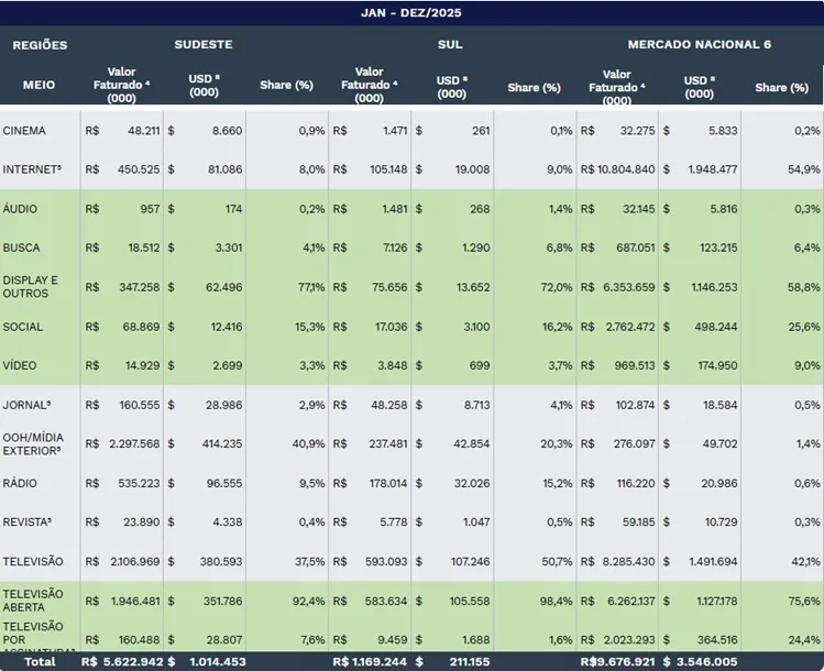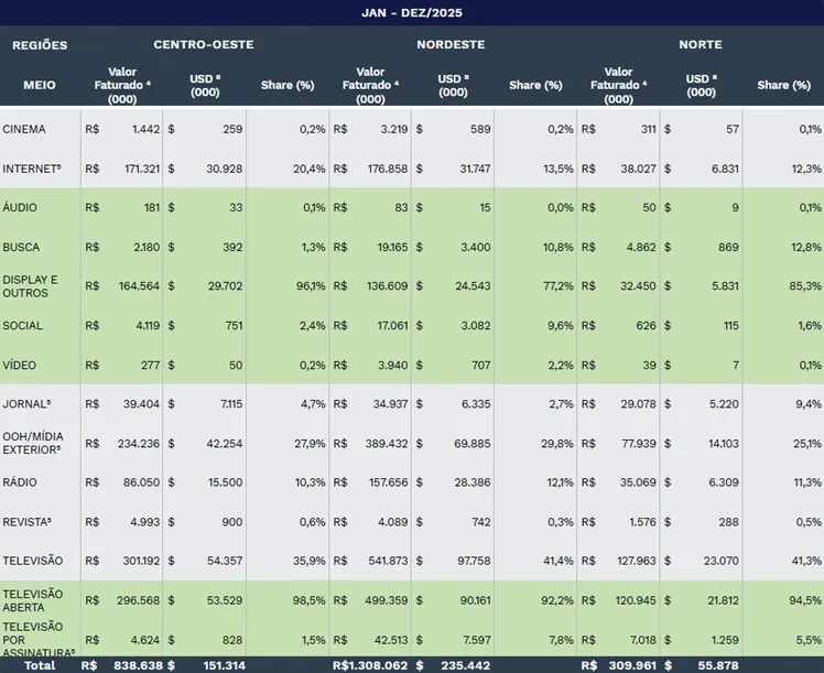 Os dados do Painel Cenp-Meios revela também o volume de negócios nesta área por região e nos estados durante o ano passado