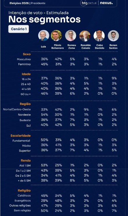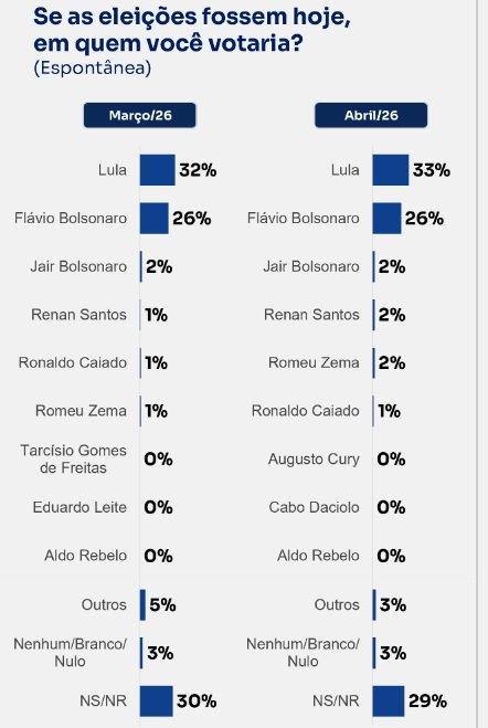 O levantamento de hoje, divulgado pelo BTG/Nexus, aponta que Lula da Silva e Flávio Bolsonaro continuam liderando a corrida presidencial